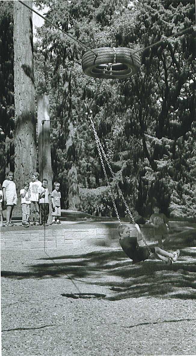 Boy sliding down suspended swing while seven other children wait their turn. Swing is on pulley suspended by chains. Front margin "KIDS ENJOY THEIR FINAL DAYS OF SUMMER VACATION ON THE NEW PLAYGROUND AT LINCOLN PARK." and "PHOTO BY BRUCE H. SAVADOW 9/8/99" and "103%". In folder marked "PLAYGROUNDS"Collection