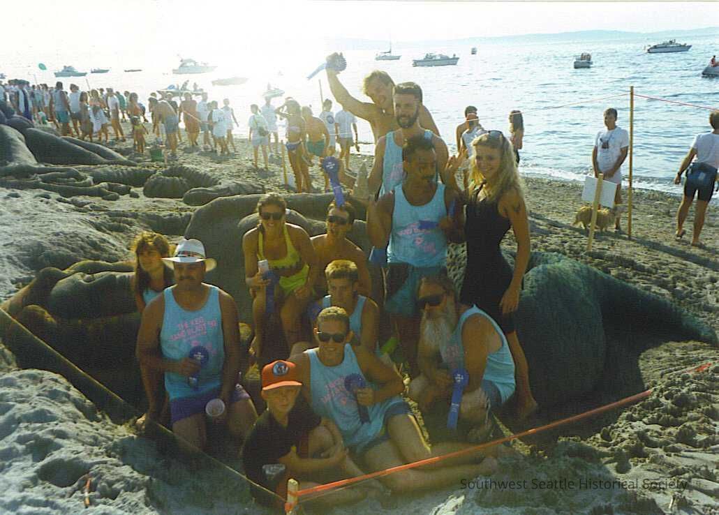 Color photo of 12 people in front of large sand sculpture with beach and water and crowd of people in background. Back of photo "V Built Construction" "1st place" and "Creatures". In folder marked "ALKI FESTIVALS"Collection