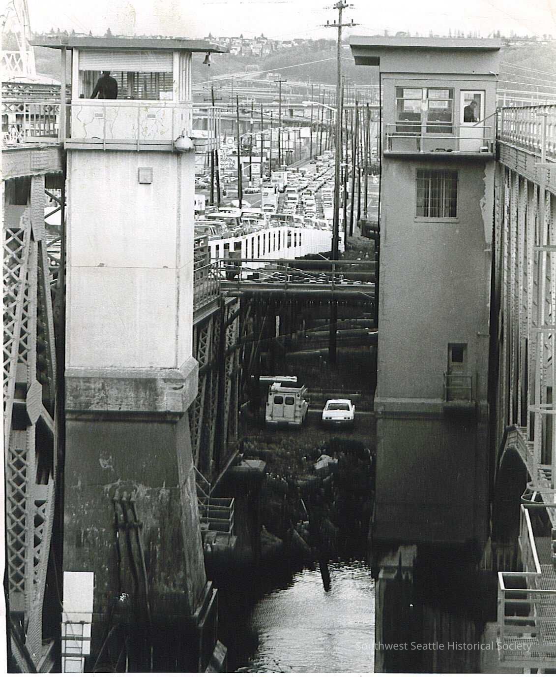 View of two towers between bridge spans, with operators visible in each, water and cars parked below. Bumper to bumper traffic on left span of bridge. Green slip attached with tape with pre-printed categories, with handwritten blue specific information" Publication W.SH Percent 100% Copy Identification Bridge." Also "1974" and "W.S. Herald". In folder marked "WEST SEATTLE BRIDGES"Collection