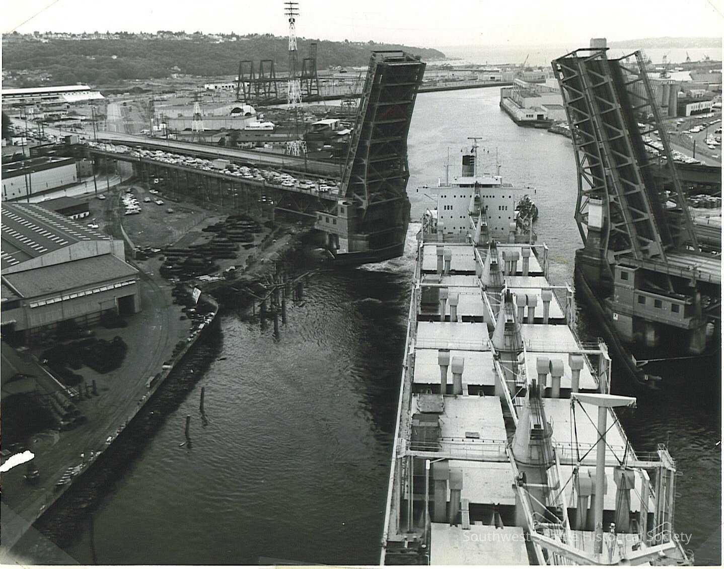 View of open West Seattle bridge from above, with ship passing through, and cars lined up on bridge. Green slip attached to back with tape with pre-printed categories, with handwritten red specific information "Publication WS Percent 50 Col. Width 2 Copy Identification 766." Also "187" above "23" with line, then "164" below line. Top 1/3 of stamped number and date readable on back of photo, remainder looks like it was removed when tape covering it was removed. Date appears to be 1972. Handwritten "100%" on back of photo. Back of photo stamped "WEST SEATTLE HERALD" and 'CITY OF SEATTLE ENGINEERING DEPARTMENT PHOTGRAPHER CHUCK THOMPSON. In folder marked "WEST SEATTLE BRIDGES"Collection