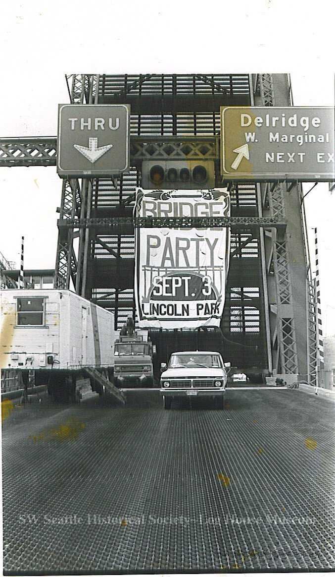 Open bridge with large banner hanging from open bridge "BRIDGE PARTY SEPT. 3 LINCOLN PARK". Traffic lane markers overhead read "THRU" on left and "Delridge W. Marginal NEXT EXIT". Trailer, van and truck parked on span facing away from open bridge and toward camera. Handwritten in red pencil on back "Photo by - Chris Styron". In folder marked "WEST SEATTLE BRIDGES"Collection