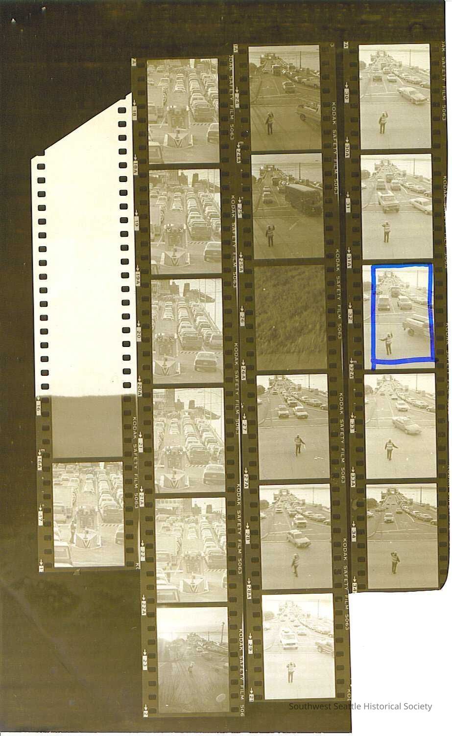Fauntleroy Ferry traffic. Contact sheet of 18 images. Note stapled to ULC (removed): "Fauntleroy Ferry Traffic / Survey"and "I'm going to be reshooting this w/more incoming cars. Not for this week, anyway." Image #32 is circled. "Radford" written on pencil on verso. "9403" written in pen on verso.Collection