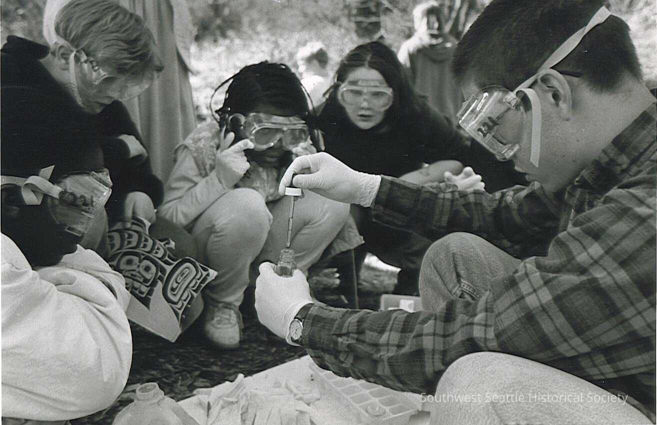 Highpoint Elementary students on science field trip. "Highpoint Elem. students / Evan Miller Garfield" written in top margin. "Demonstration of oxygen test Longfellow Creek" written in right margin. Printer's notations written in bottom margin. "Ralph Radford photo" written in pencil on the verso.Collection