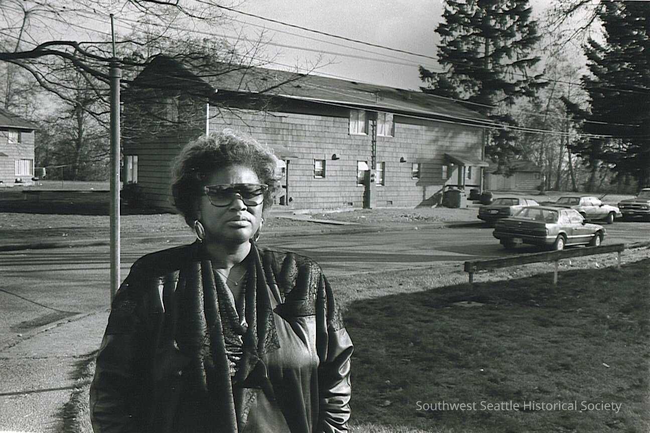 African American woman on street. "Barbara Beaver, High Point" written in top margin. Printer's notations written in right margin. "Ralph Radford photo" written in pencil on the verso.Collection