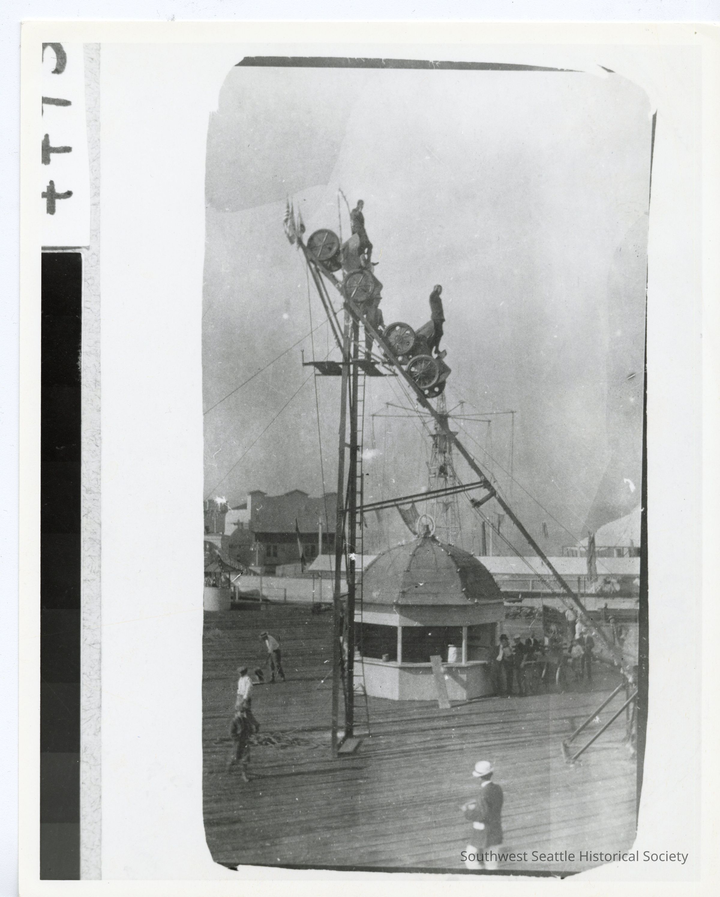 BW photograph. Two individuals on small carts on top of tall, steep track at Luna Park.