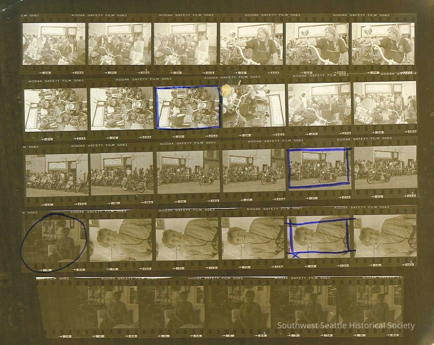 Contact sheet with 30 images: 18 are of a "Tacorama" event at Alki Tavern, with crowds of motorcyclists and their choppers in front of it (Images #25 and #21are circled in blue); 11 images are of a seated woman (#9 and #13 are circled in blue). "9407" written in pen and "Motorcycles @ Tacorama near The Embers on Harbor Ave" written in pencil on the verso. This sheet was stapled behind 2005.032.0221 and 2005.032.0220, with the following note: "Tacorama / #4a, primary / secondary - #6a, #20 (both sheet 2)". Also "I prefer 23 on Sheet 2".Collection