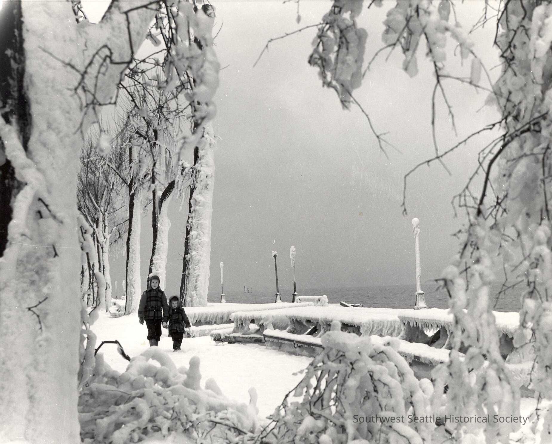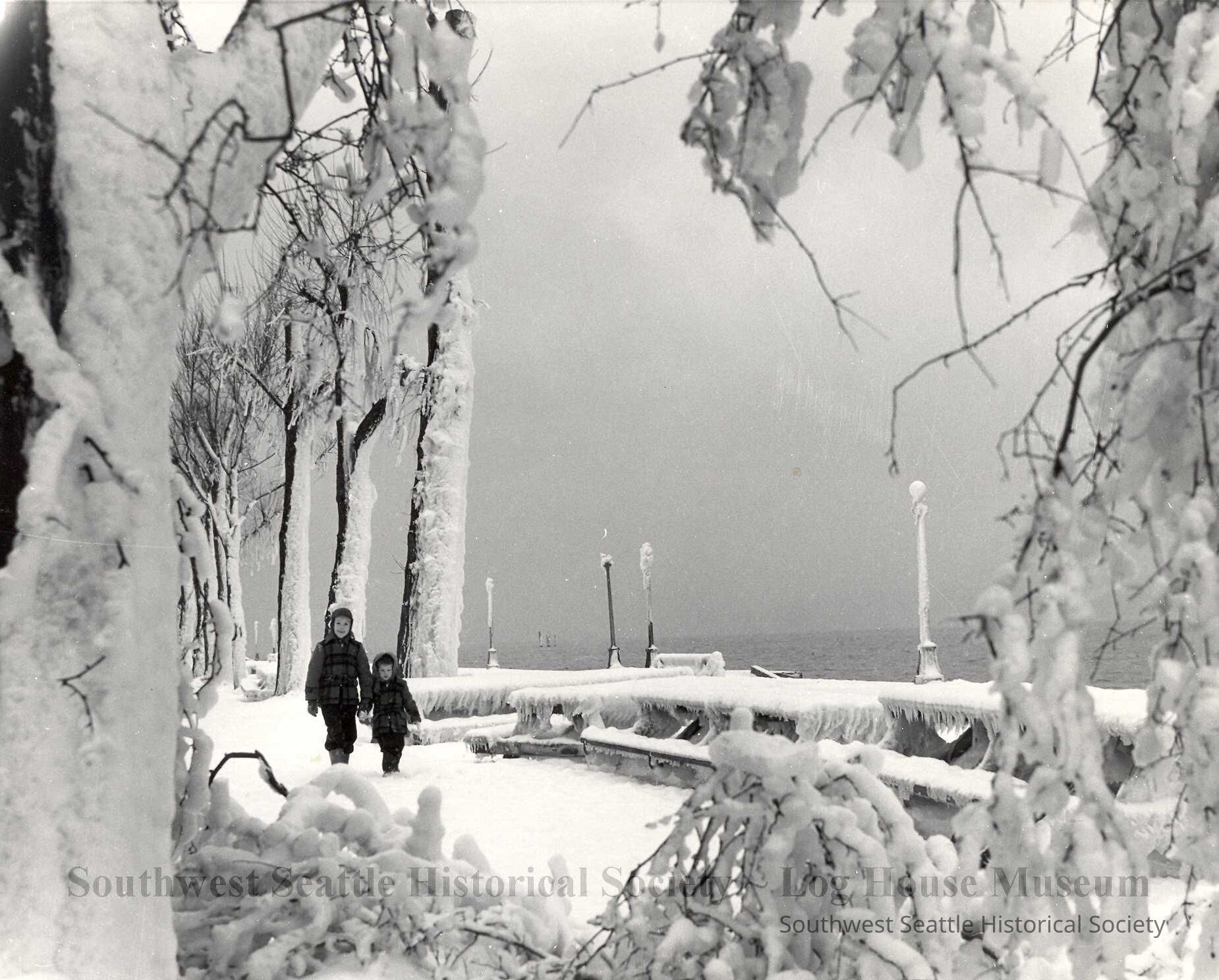 Photograph of two young boys walking in the snow and ice at Alki Beach. Seriously cold. Note: This is the same two boys as in a Clay Eals photo P361.