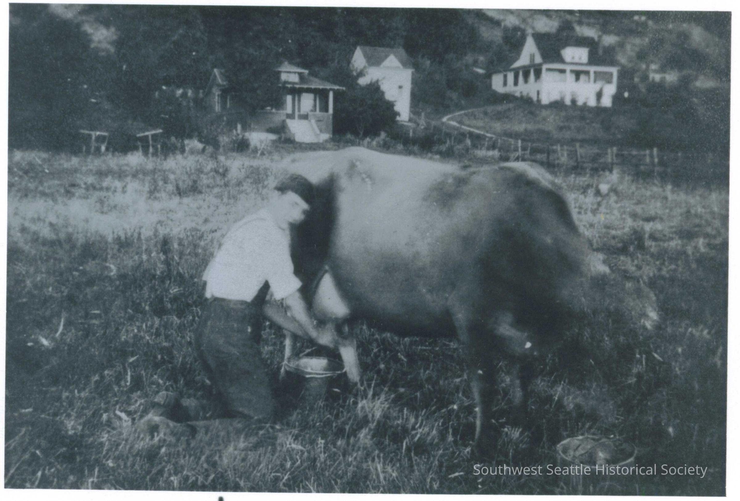 Photo taken from Ramquist property looking east. Image shows Gaius Ramquist milking the Ramquist cow. The Tinker home is in the backgroun on the left and the old Lillevand barn enlarge into a house.