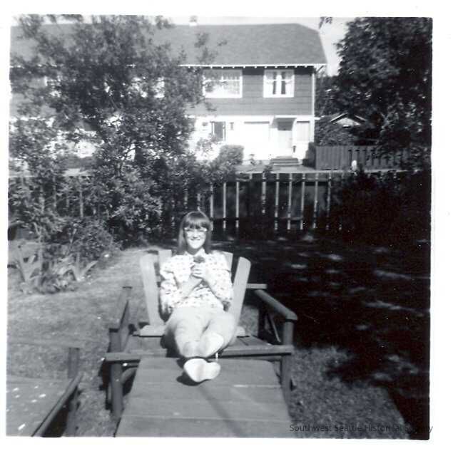 1966, Spring: Marianne Gray lounging in the backyard of the Log House, photo looking east at the duplexes on 61st Ave SW.