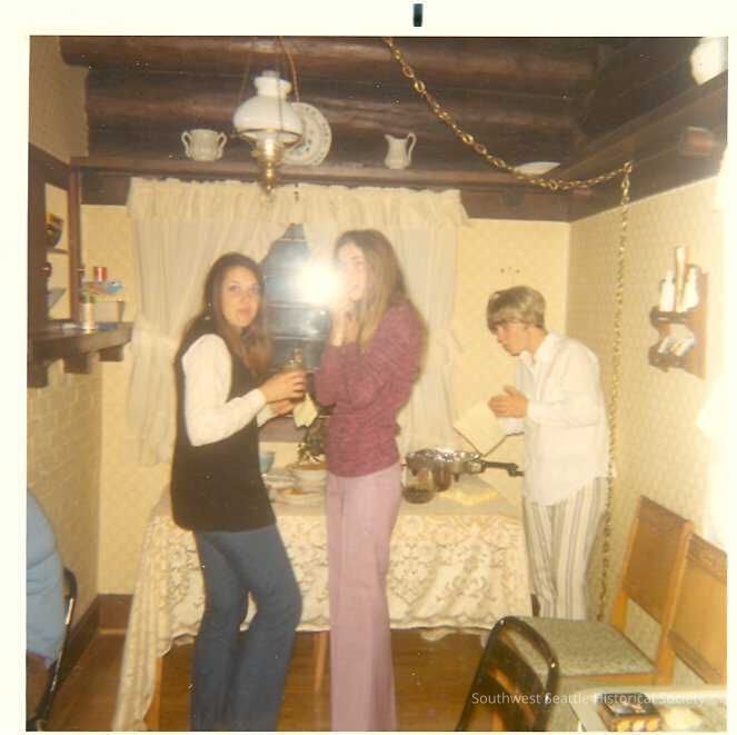 1971, July: Interior of Log House with Bonnie Cork, Marilyn Davis and Denise Johnsen