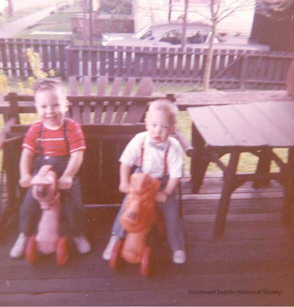 1965, April: Christopher Johnsen, left and Eric Peterson, right, on front porch of Log House.
