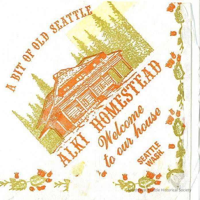 Alki Homestead Restaurant napkin "A bit of old Seattle, Alki Homestead, Welcome to our house, Seattle, Wash" white napkin with red and gold detail.