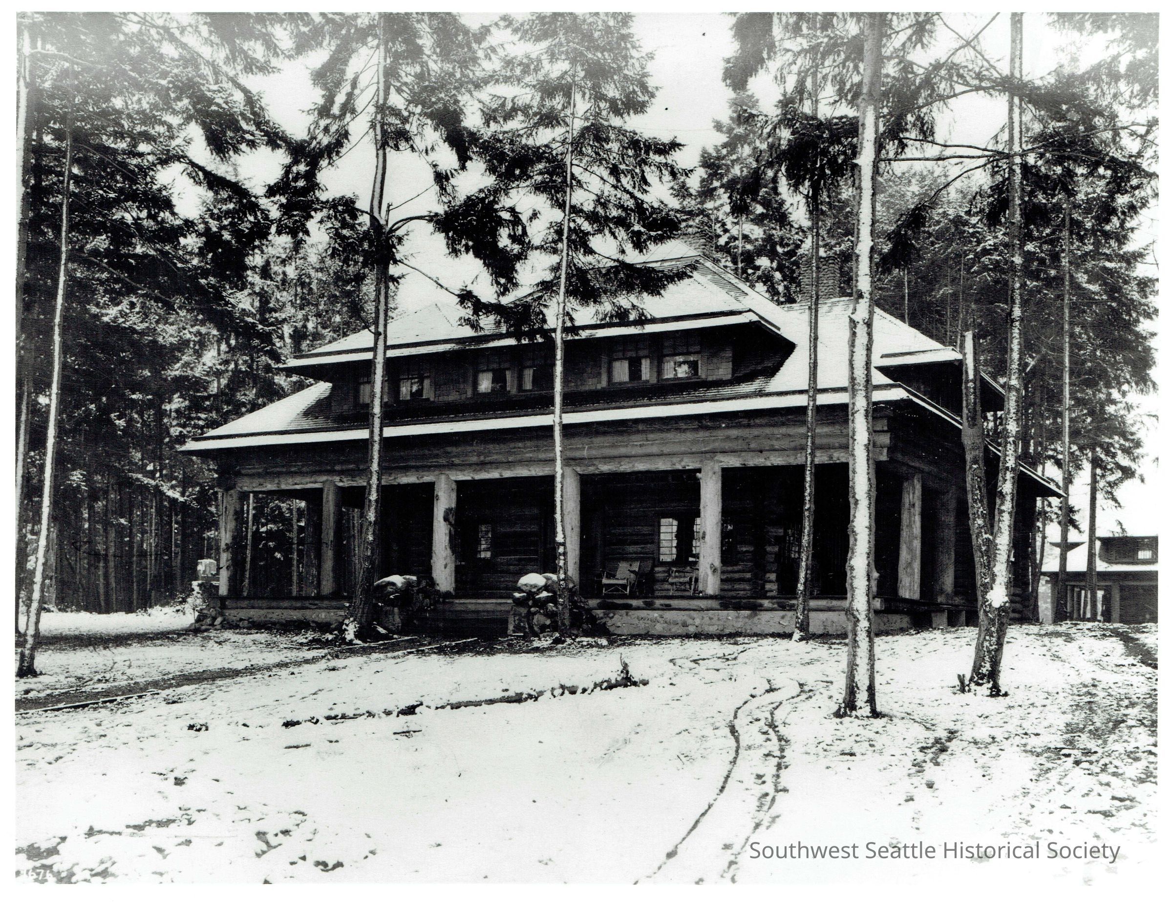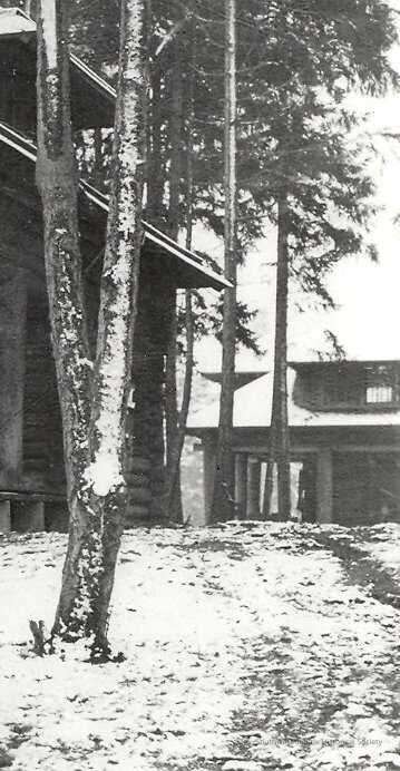 BW photo - a 3/4 view of Fir Lodge, facing west. Shows details of porch and columns. Building on right is probably the building that is the present Log House Museum in it's original location. It was originally a carriage house. A light snow is on the ground.