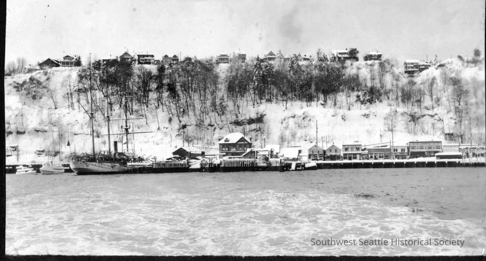 Harbor Avenue, Railroad Avenue in the snow. West Seattle Land and Improvement center.
