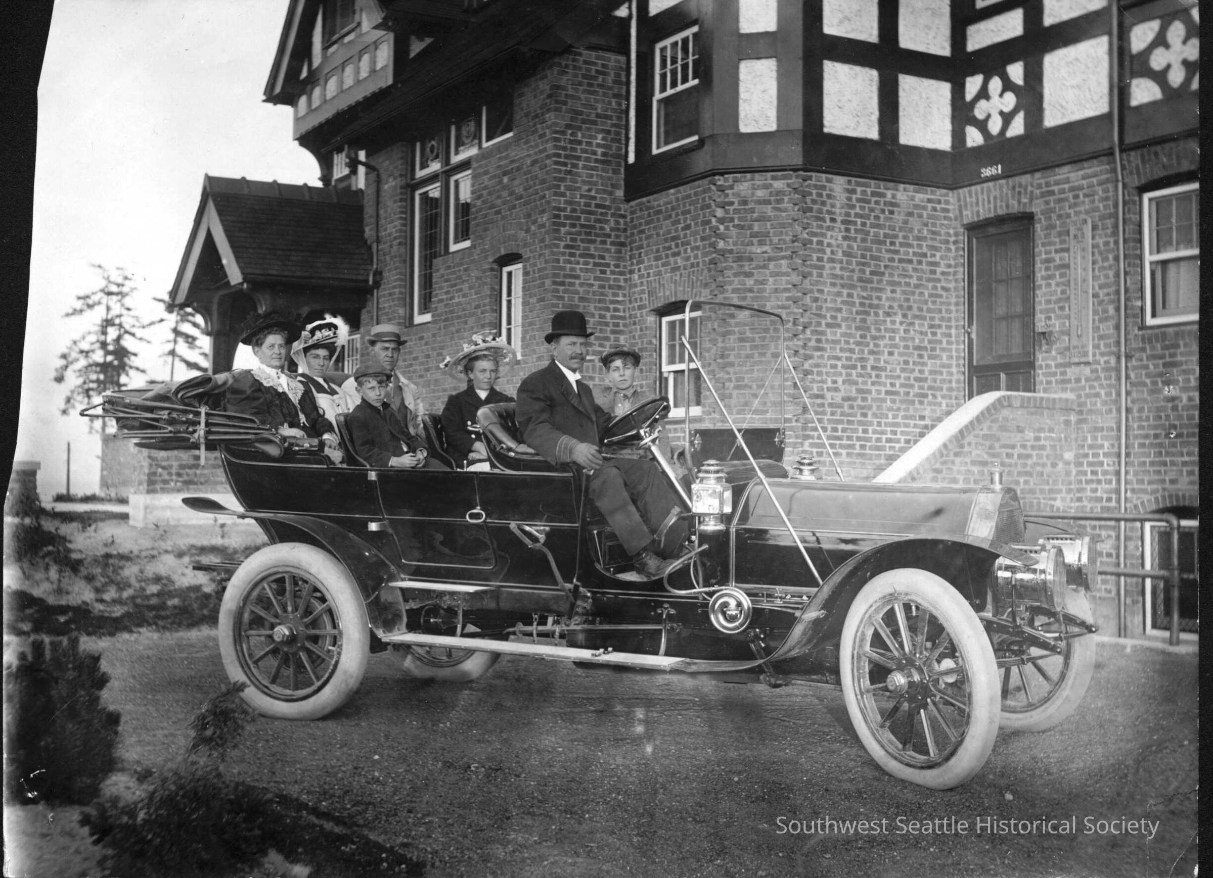 Hainsworth family in their car in front of the Hainsworth House, built by William Henry Hainsworth III.