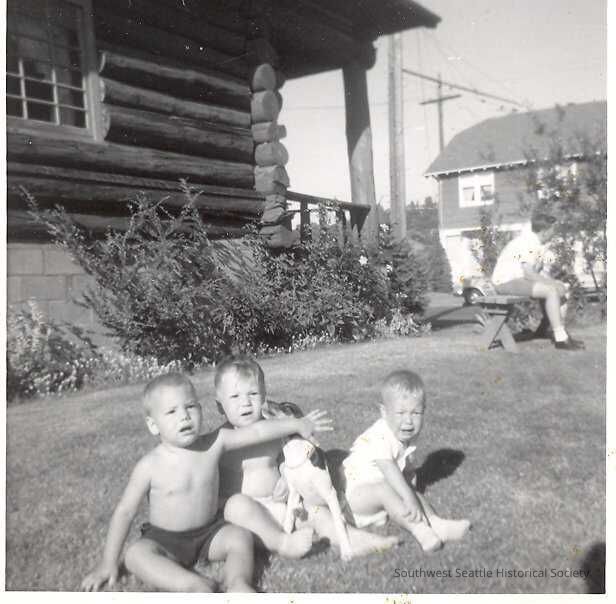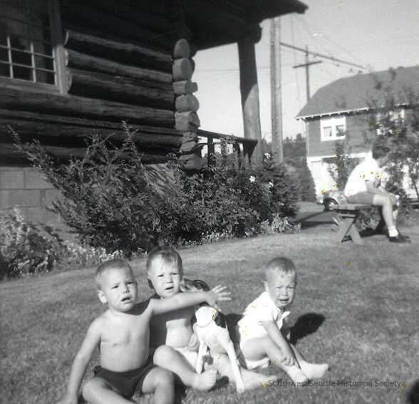 Three boys being loved by the family dog, one not so happy about it. This is outside (what is now) the Log House Museum. Probably 1964-5.