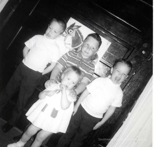 Three boys at the front door with a little girl at a birthday party (pin the tail on the donkey is on the door behind them) This is (what is now) the Log House Museum. June 1968.