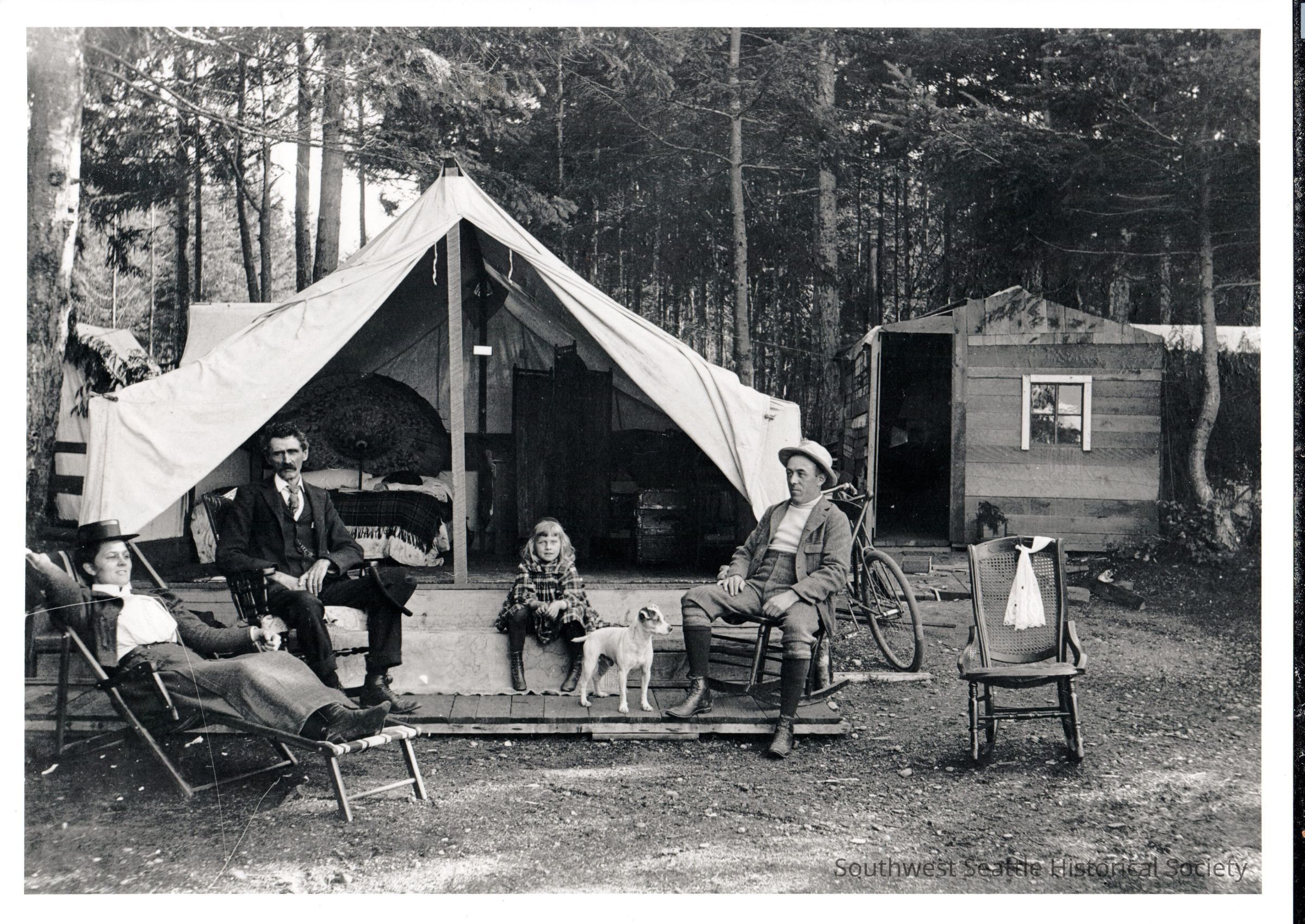 BW photo of Bernard family at tenthouse on Alki prior to Fir Lodge construction.
