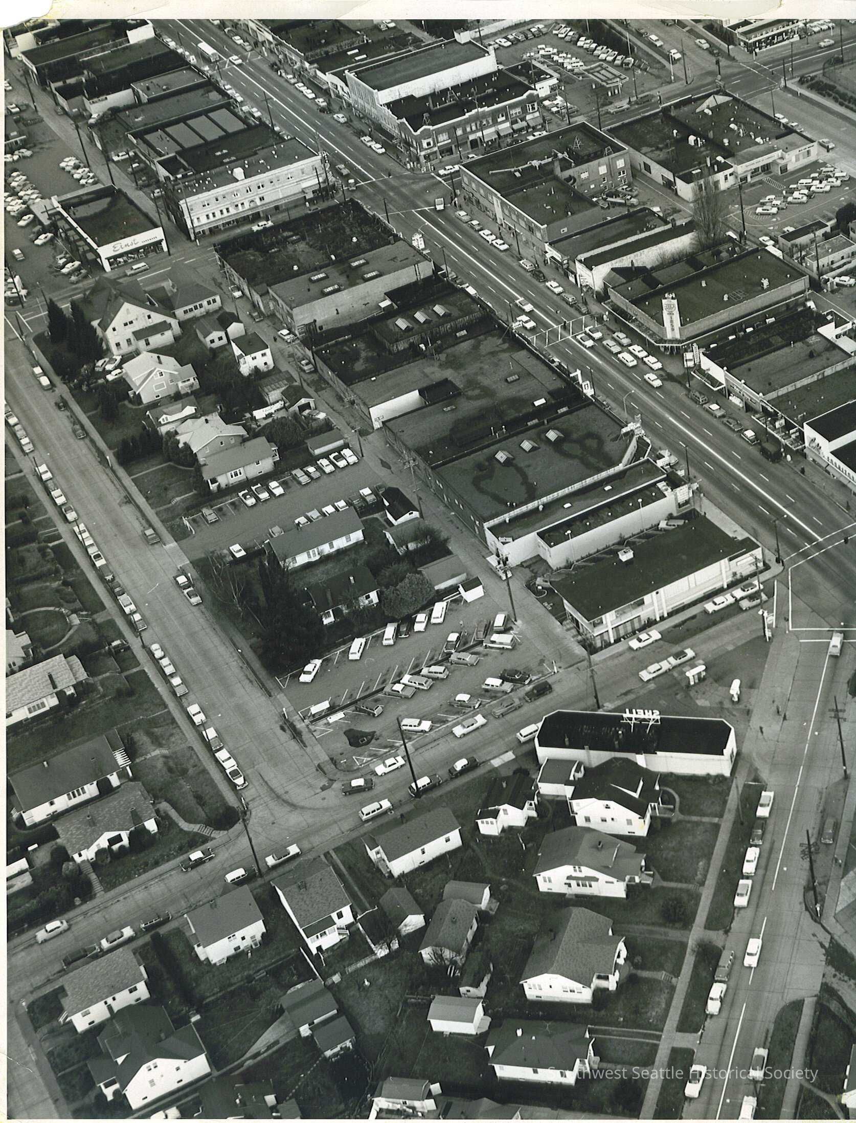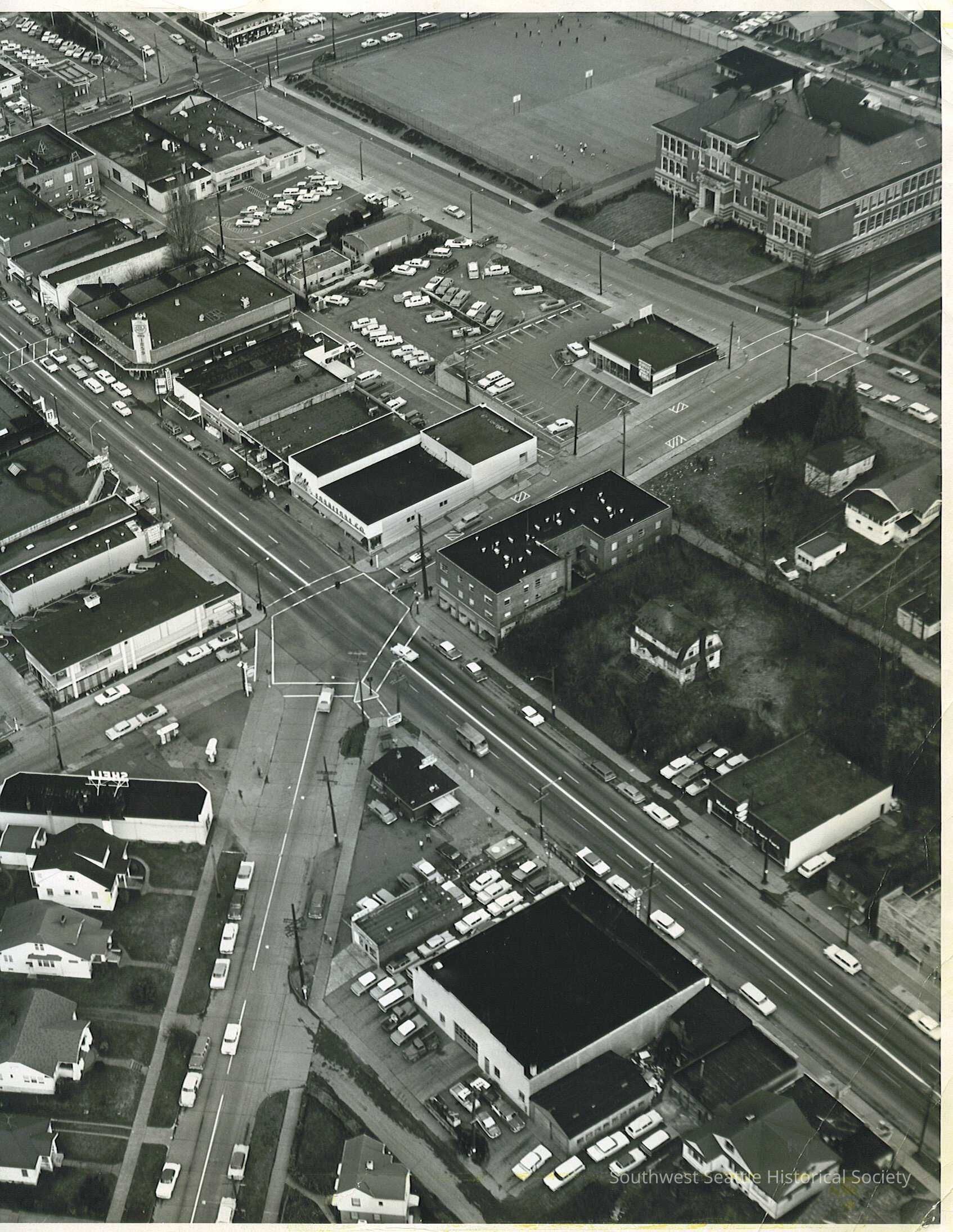 11"x14" Aerial photo centering on West Seattle Junction, California Ave and SW Alaska St, from 44th SW to 40th SW. Erskine Way shown. Includes Jefferson Grade School and West Seattle Rambler, Shell ser, A&P grocery store Shell service (gas) station at corner of Erskine and California, West Seattle Fire Station #32, Ernst hardware store. Junction south of Alaska St. Alaska Junction businesses. see item # 1998.035.0010.1 for another angle of this view showing further north on California Ave.