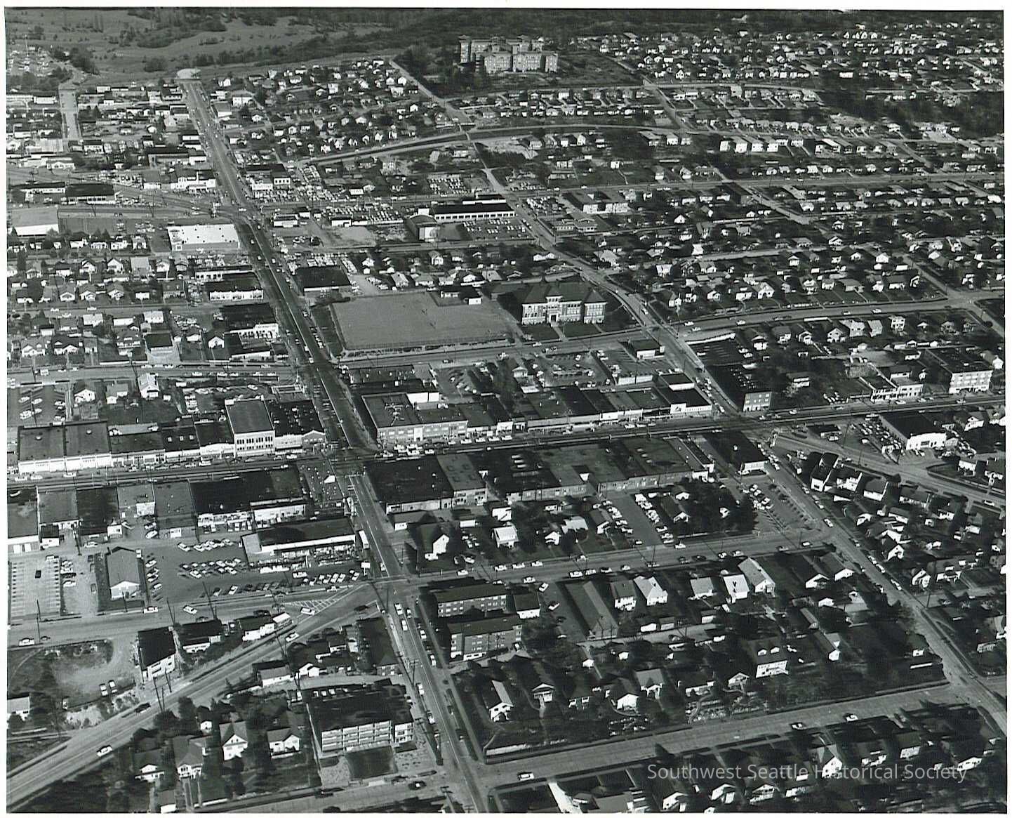 8"x10" aerial photo showing Alaska Junction c1962. SW Oregon St to SW Hudson St., 35th Ave SW to c45th SW. Jefferson Grade School, Mt. St. Vincent on 35th SW, west view of Ernst Hardware, Fire station building, Shell service station. see 1998.035.0010.1 and 11.1 for additional aerial views from other angles.