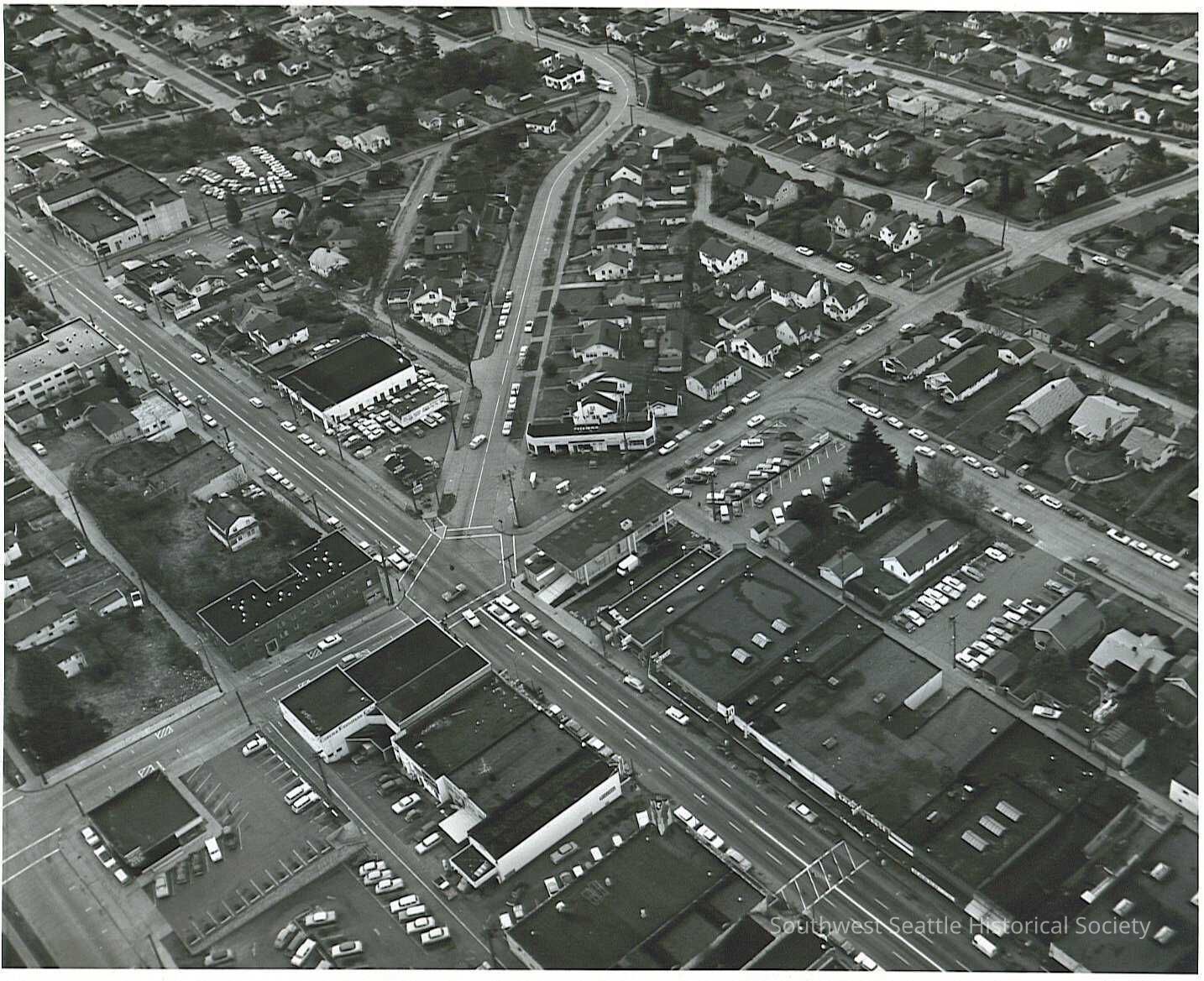 View of California Ave at Edmunds and Erskine Way. 8"x10" photo aerial view showing Carlile Furniture, West Seattle Rambler, Granada Theater, Shell service station, G. O. Guys drugstore.
