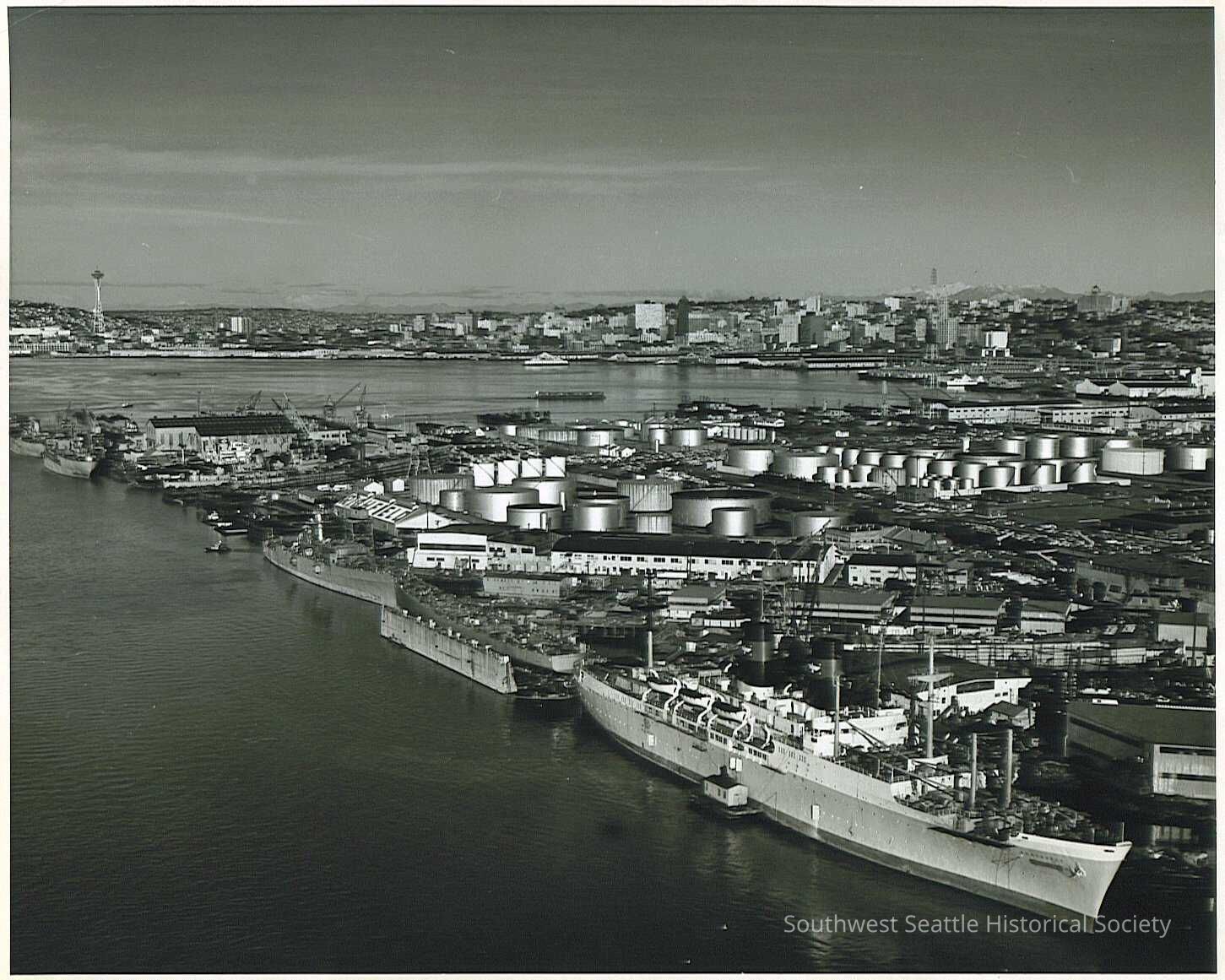 Harbor Island along the west waterway of the Duwamish River. Seattle skyline in background includes Space Needle and Smith Tower. Vessels moored in waterway, one in dry-dock. Todd Shipyard on left, Lockheed on right. Vessel "President Roosevelt" visible on right. Richfield tank farms visiblbe in center. Photo measures 8"x10"