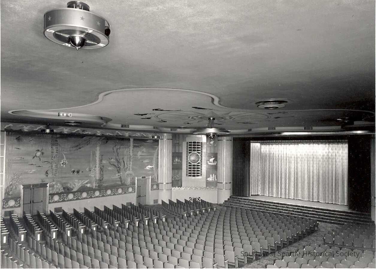Interior of the Admiral Theater, 1942. With mural and ceiling zodiac decoration.