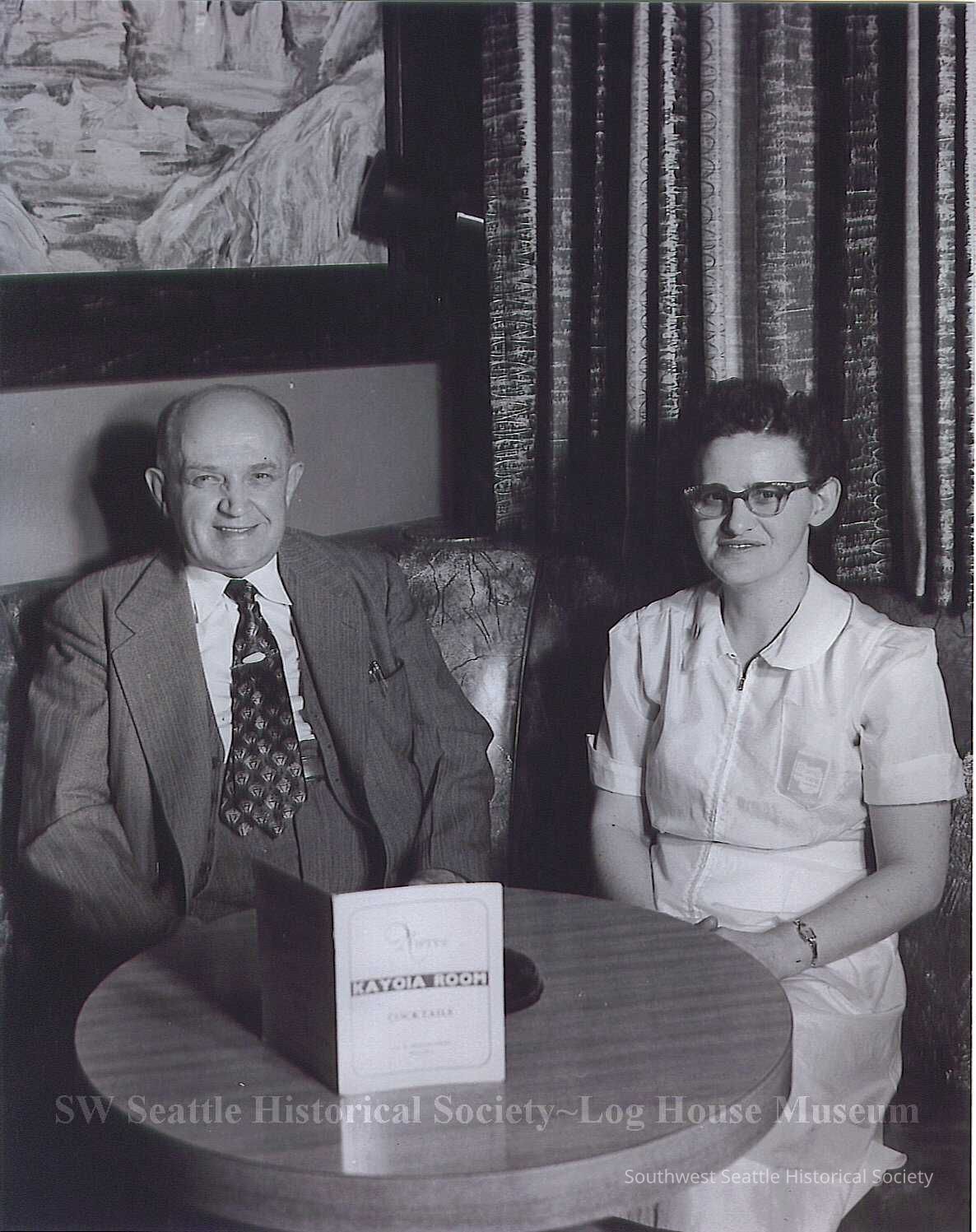 Man and woman seated behind small round table, in front of curtains. On table is upright folded placard which reads "Nifty's KAYOLA ROOM Restaurant." Middle aged bald man is on left in photo wearing medium colored suit, dark patterned tie, and light colored shirt. Middle aged woman is wearing light colored short-sleeved dress (could be waitress uniform), has short dark hair and dark rimmed glasses. On back of photo is stamped "109285, Scan5_0005" and "Ritz, R1029, 11/03/07". Was in cardboard envelope with logos from various "Camera & Image" companies, including Ritz Camera & Image.