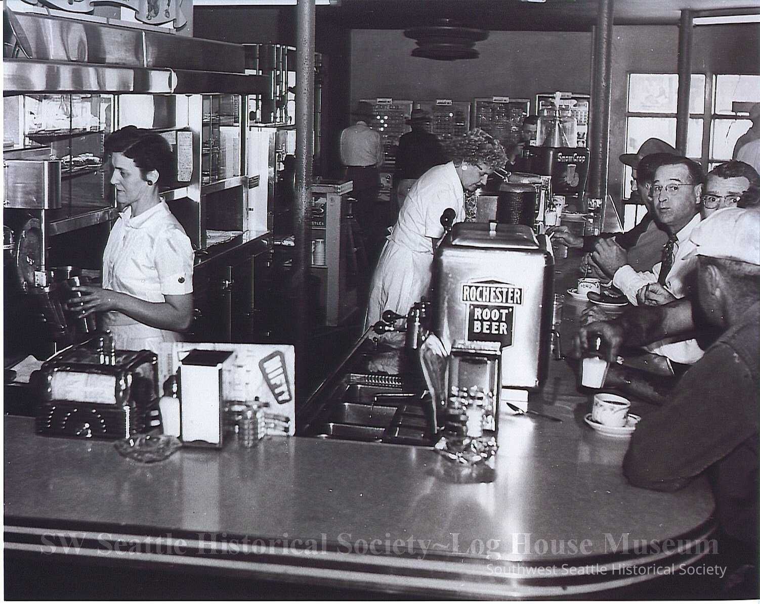 View of Nifty's Restaurant from corner of counter, includes patrons seated at counter with food and drink, and two waitresses in light colored dresses behind counter. On back of photo is stamped "109285, Scan9_0009" and "Ritz, R1029, 11/03/07". Was in cardboard envelope with logos from various "Camera & Image" companies, including Ritz Camera & Image.