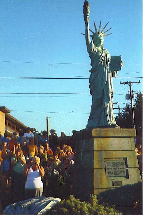 Color photo of Alki Statue of Liberty and pedestal on right of photosurrounded by crowd of people. On back of photo is stamped "061423 FILER0614 dsc00888". Was in envelope from "One Hour In Store Photo Service at Bartell Drugs". Envelope reads: 9-11-07 Statue of Liberty" "Log House Museum" and "Andrea, Thought you might like to have these. Pat".Collection