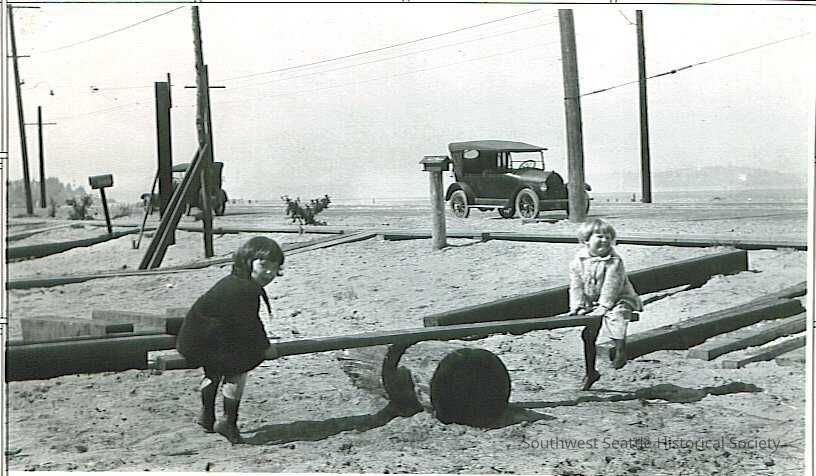 Black and white photograph of two girls teetertottering on board across log. Other logs and car in background. Written on back of photo is "5" underlined. Letter accompanying photographs identifies photograph "No. 5 In front of Grandma's house - Note wood sidewalk. Street car tracks other side of cars - high rockwall to water with wooden stairs occasionally to go down to water. About 1920." Bernice is on the left. Friend on the right.