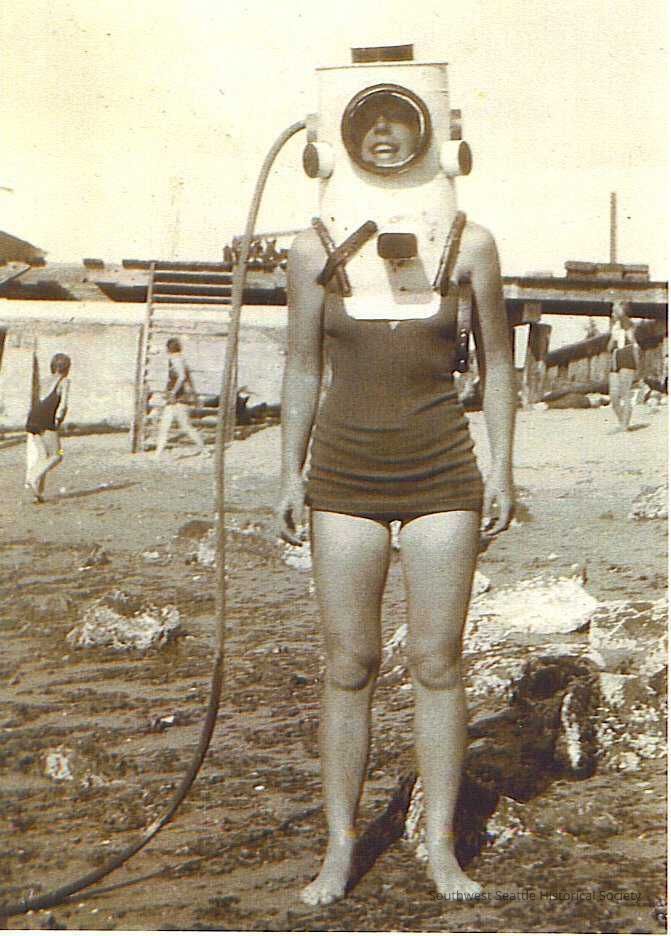 Black and white photograph of woman standing on beach wearing bathing suit and scuba type helmet connected to hose. Dock and people are behind her. Written on back of photo is "Bernice Petty 1933 - Alki Beach Seattle, WA. Address: 2101 S. Garfield #145 Loveland, CO 80537 Tel. 970-667-6791", "1933 - age 16 I'm now 90 yrs", "Old Luna Pool dock", and "11 [underlined]". Letter accompanying photographs identifies photograph "10 & 11 Ten shows end of pier. I know when Luna Pool was there, the dock extended far into the water. This picshows the end of it. I'm just sending it to show how short the actual dock was at that time. Most of the logs must still have extended out into the water for us to have scuba-dived."Relationships