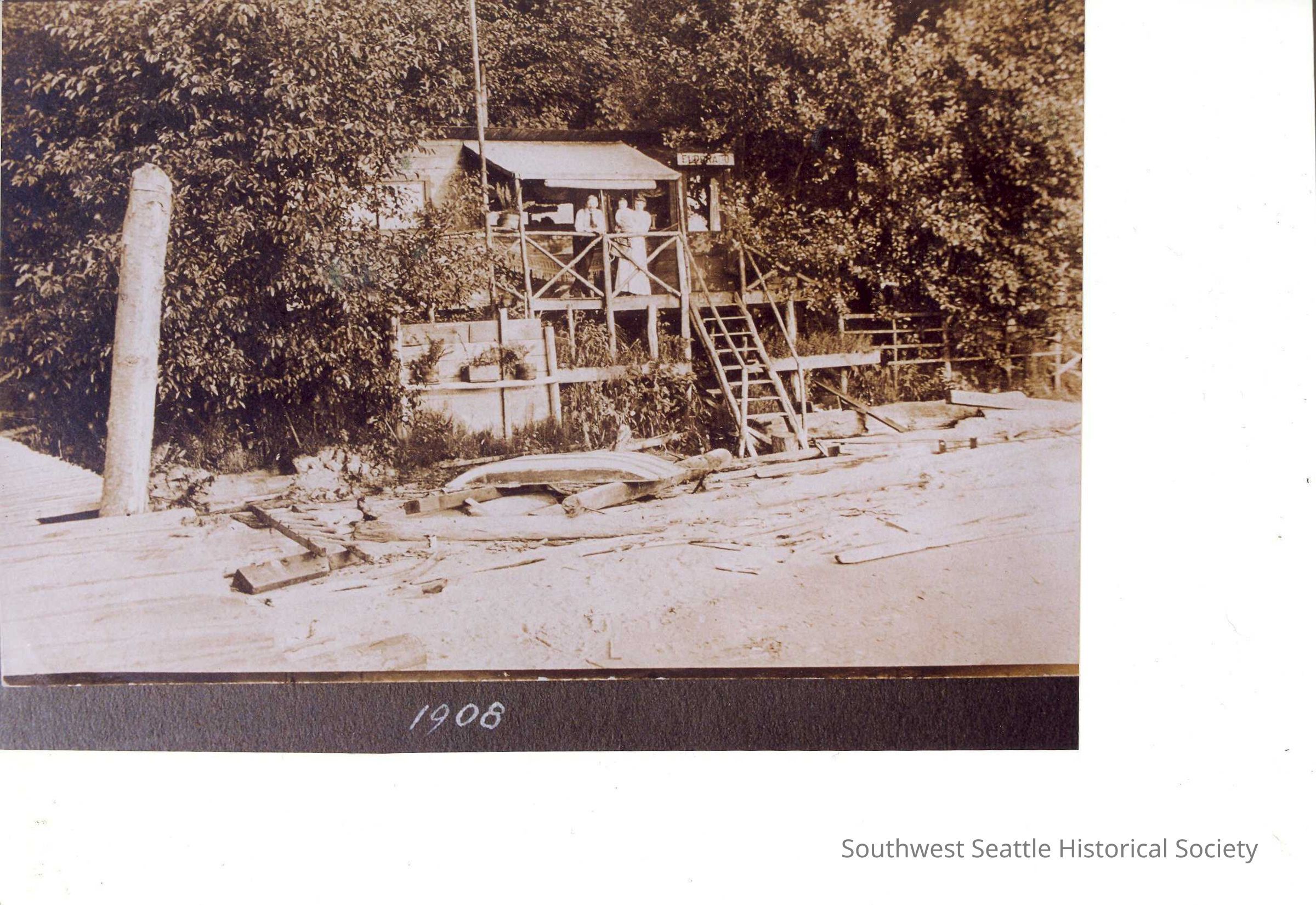 black and white photo of Carl and Johanne Kroll with first baby standing on the porch of the El Dorado cabin on Alki Beach. Before it was called the El Dorado, the cabin was known as the Dutchman. The Krolls stayed at the cabin from 1906-1908