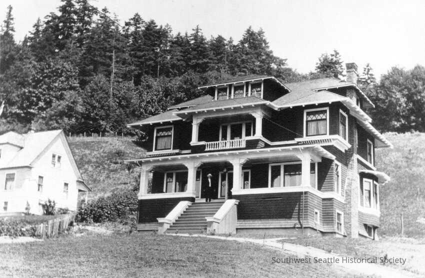 2 story home with man standing on porch Satterlee House built circa 1906. Originally owned by Ina Baker. Located on what is currently Beach Drive.