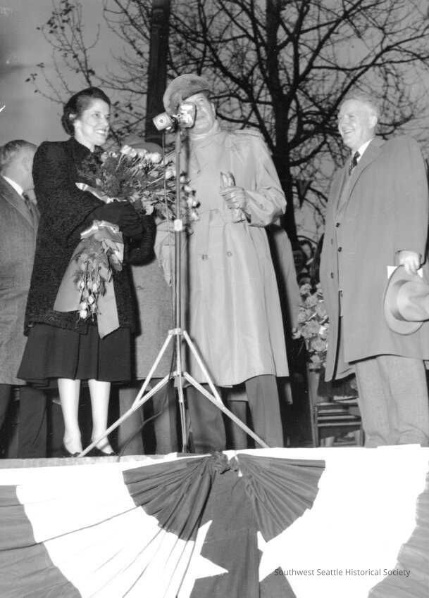 Douglas McArthur speaking at the 100th anniversary of the Denny Party landing on Alki. Standing with woman holding a large bouquet of roses and 2 men in the backgroundCollection