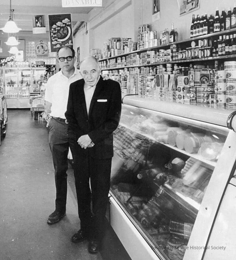 2 men standing in front of deli counter at the Husky Deli. Man in white shirt is in his 30-40's, Man in the black coat in his 70-80's.