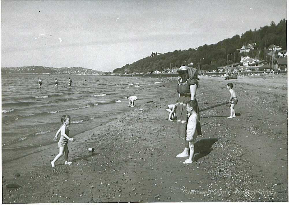 scan of white-border era postcard depicting "boardwalk at Alki, Seattle" published by C.P. Johnson, Seattle, #3033. The bandstand and bath house are visible on the boardwalk. Swimming platforms are seen in the water to the left of the bandstand. People sit on benches watching the water and several young people in swimsuits in the sand and water. Other people walk on boardwalk, the dress and fashion seems to be late 1920s and/or early 1930s. One woman seated on bench holds an umbrella with and Asian design on it. There are one or two wagons visible on the edge of the boardwalk selling snacks or treats. The stamp box on back has 1-cent postcard rate and 2-cent for foreign destinations.Collection