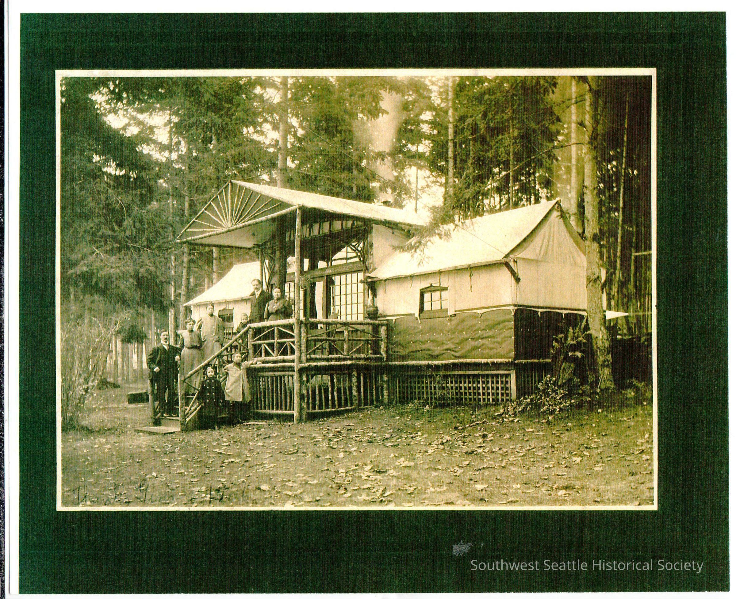 A group of men and women pose on the front porch and stairs of a tent cabin. Many trees can be seen surrounding the cabin. This is the same cabin as P631 with the addition of a larger porch and windows.