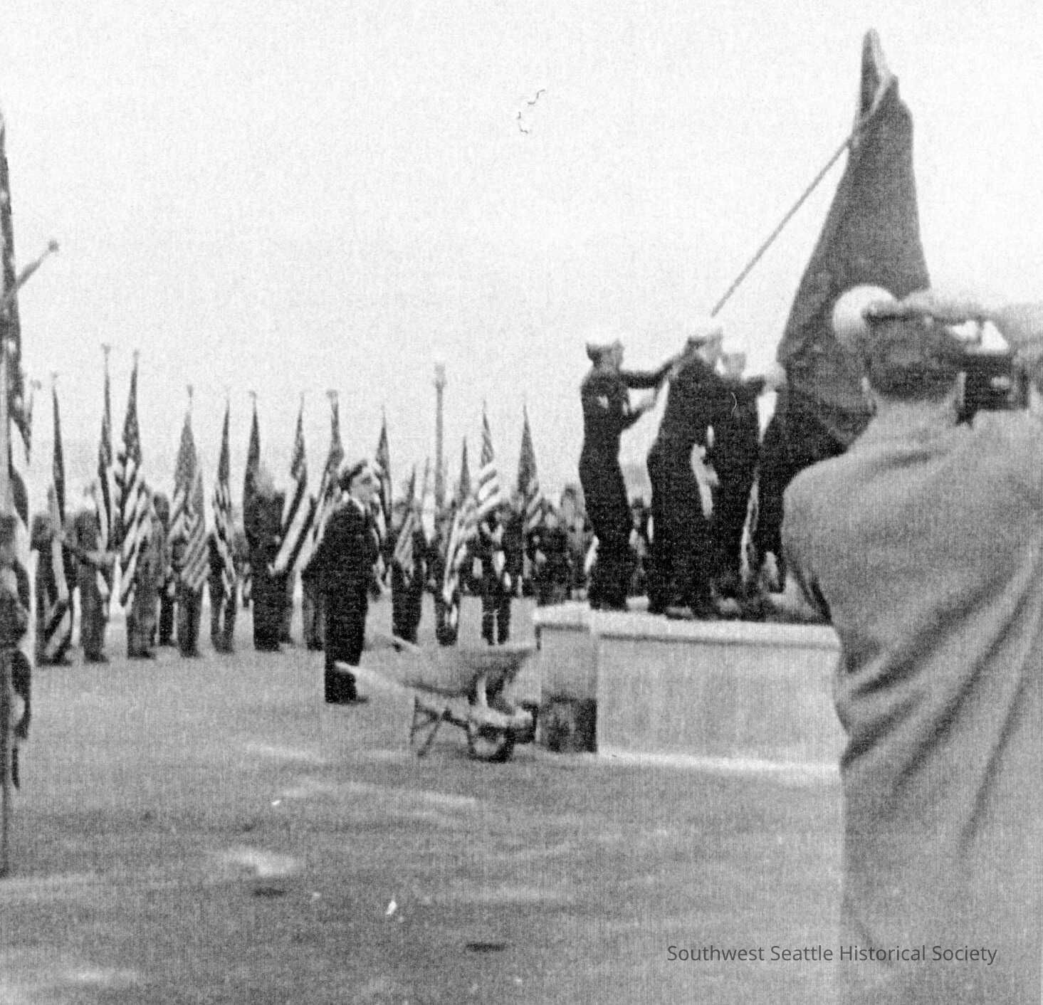 black and white photo of large group of people gathered around the Statue of Liberty monument on Alki Beach at its unveiling