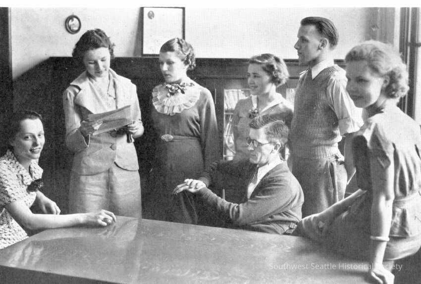 5 teenage girls and 1 teenage boy, sitting around a table with a teacher
