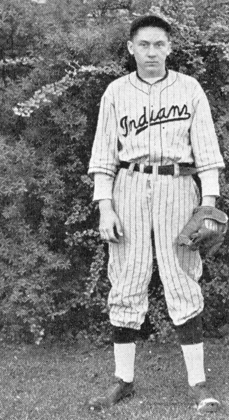 B&W photo of a boy in an "Indians" baseball uniform, West Seattle High School