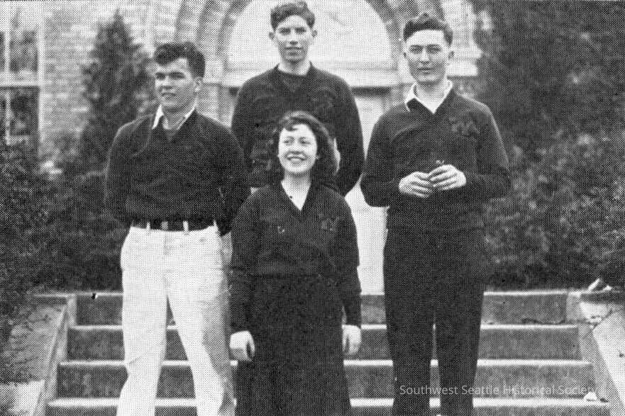 B&W photo of 4 students in West Seattle sweaters. 3 boys, 1 girl