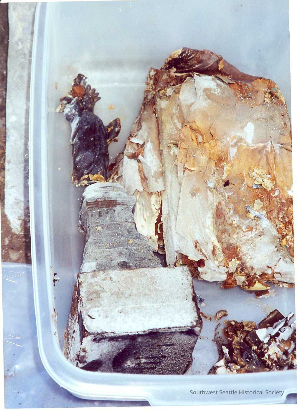 color photo of the damaged contents of the time capsule. Miniature Statue of Liberty, misc decayed items