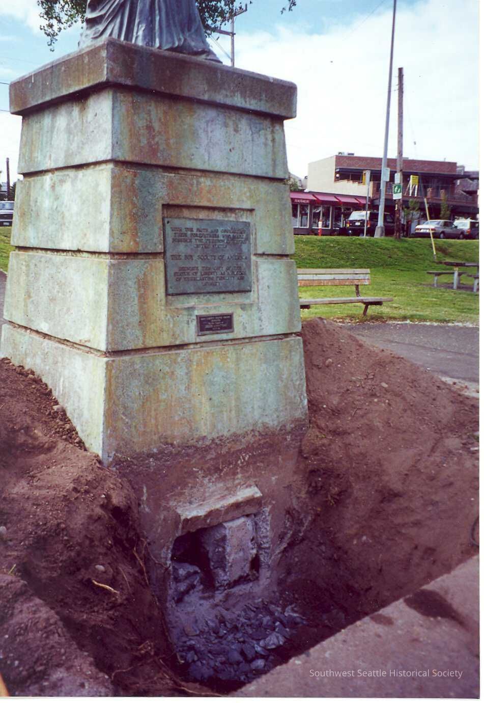 color photo of hole in front of Statue of Liberty, where the time capsule was buried