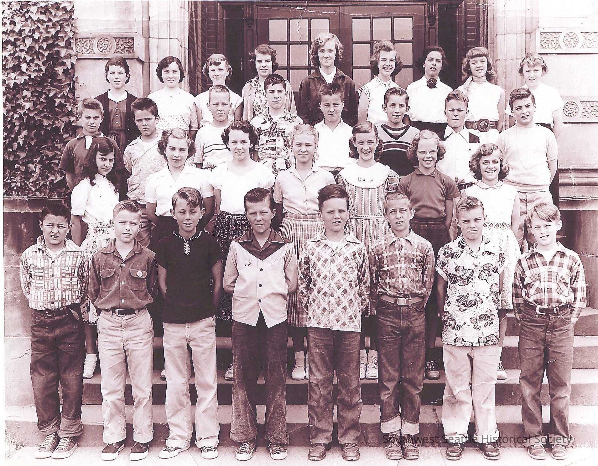 Black and white class photo. Jefferson class of 1953 Charles Kelstrom is the boy in the lower right of the photo