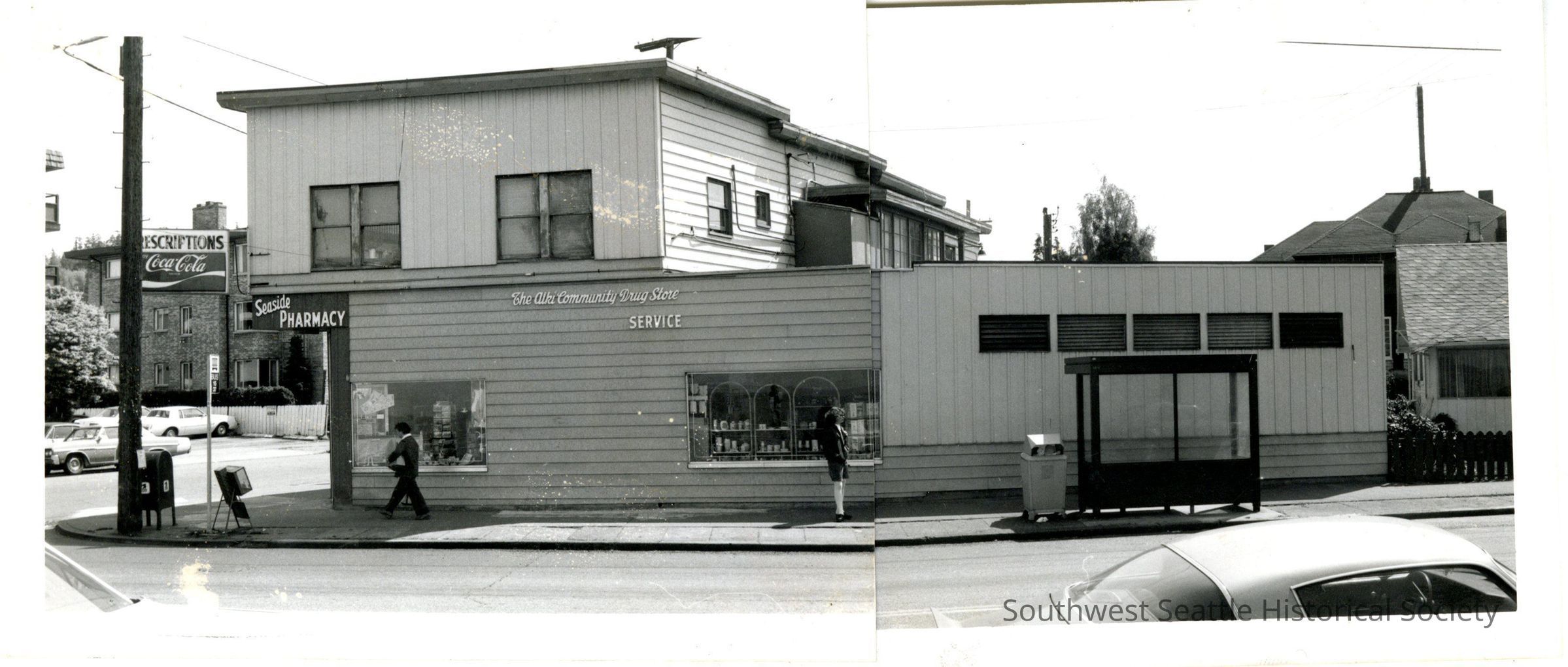 Seaside Pharmacy. Building is located at the corner of 61st Ave SW and Alki Ave SW