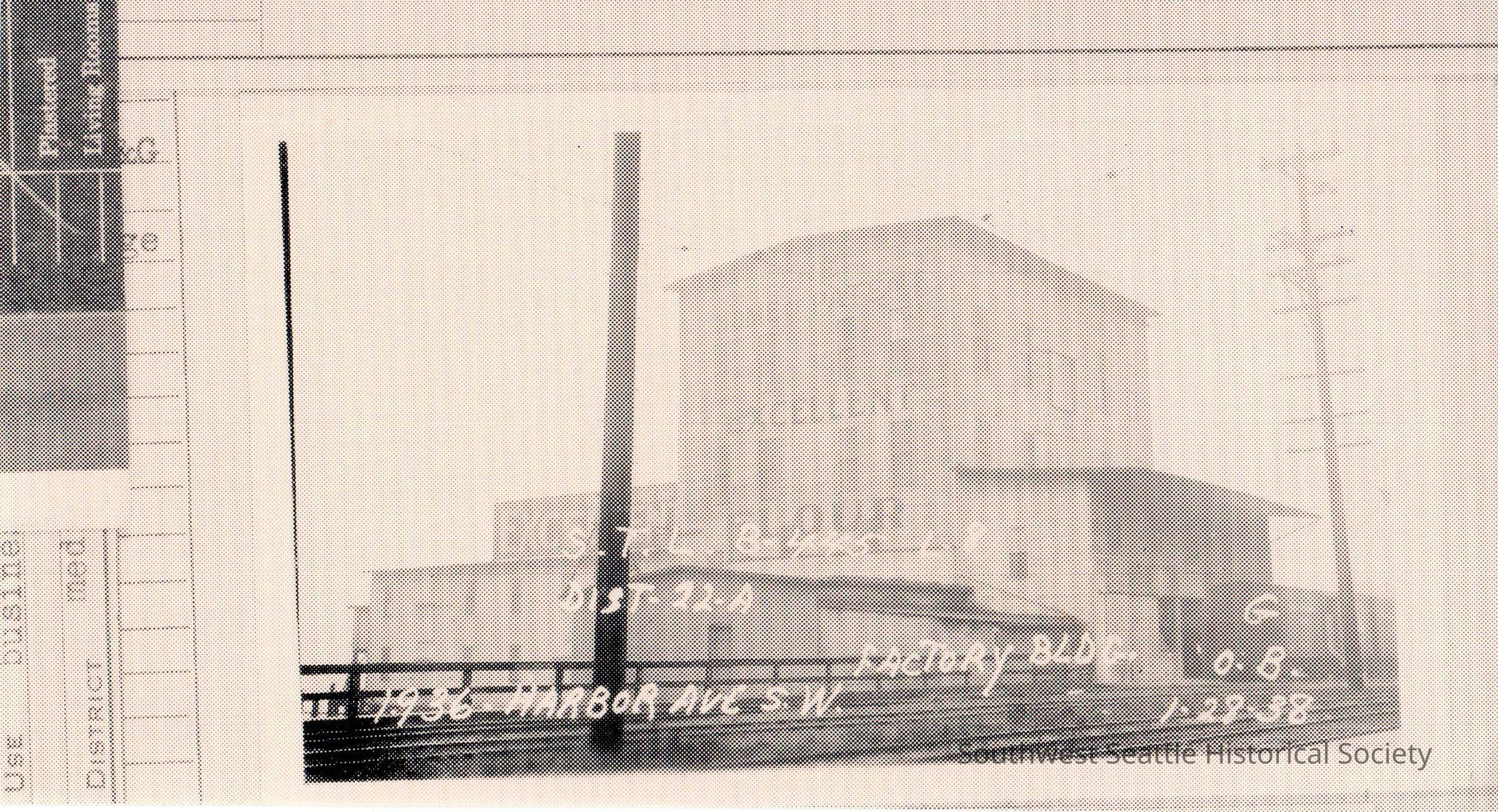 Alki / Photocopy of Old Flour Mill at 1936 Harbor Ave SW dated 1-28-38. Sign painted on building says "The Home Patent Excellent Flour" marked "S.T.L B-445 L-8; DIST-22-A; G O.B. 1-28-38."Collection