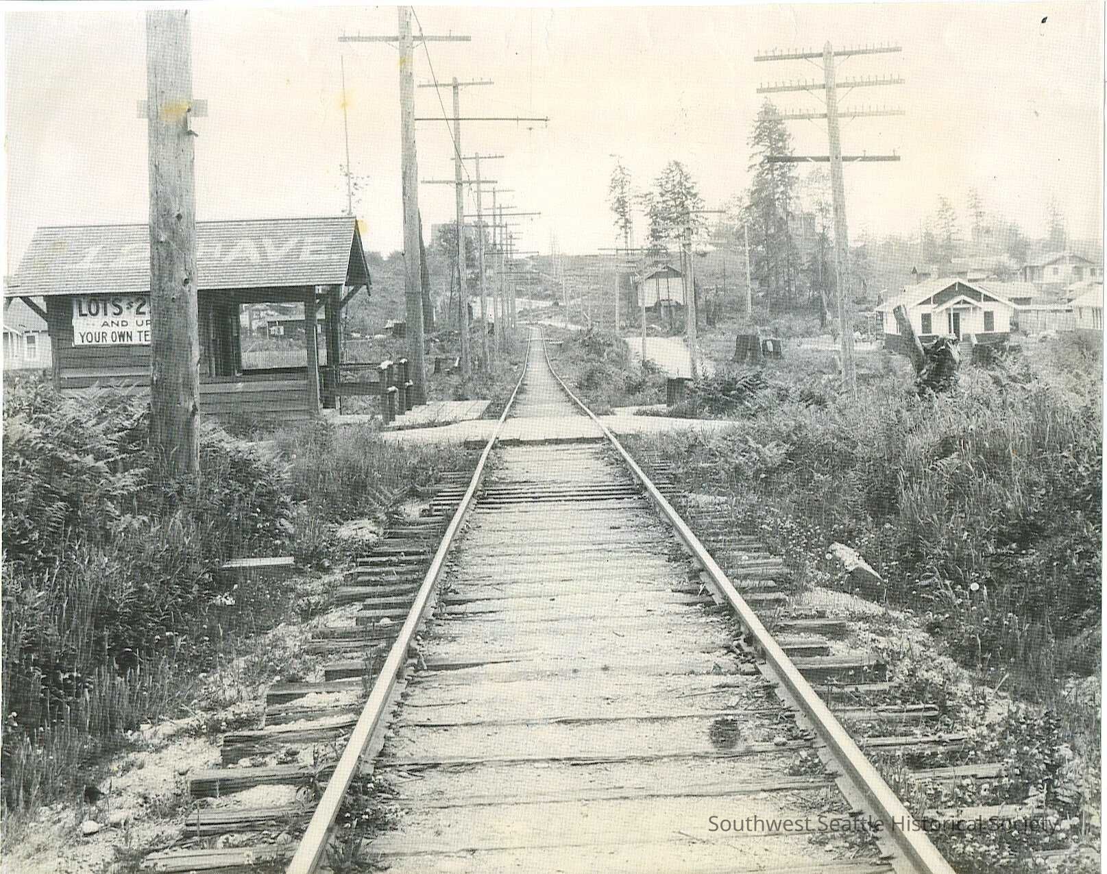 Transportation & Neighborhoods / Photo of streetcar tracks as they cross 12th Avenue. This would be for th #4 car which went to Lake Burien. Shows shelter for trolley riders, somne houses & trees. Shelter marked "12th Ave"Collection