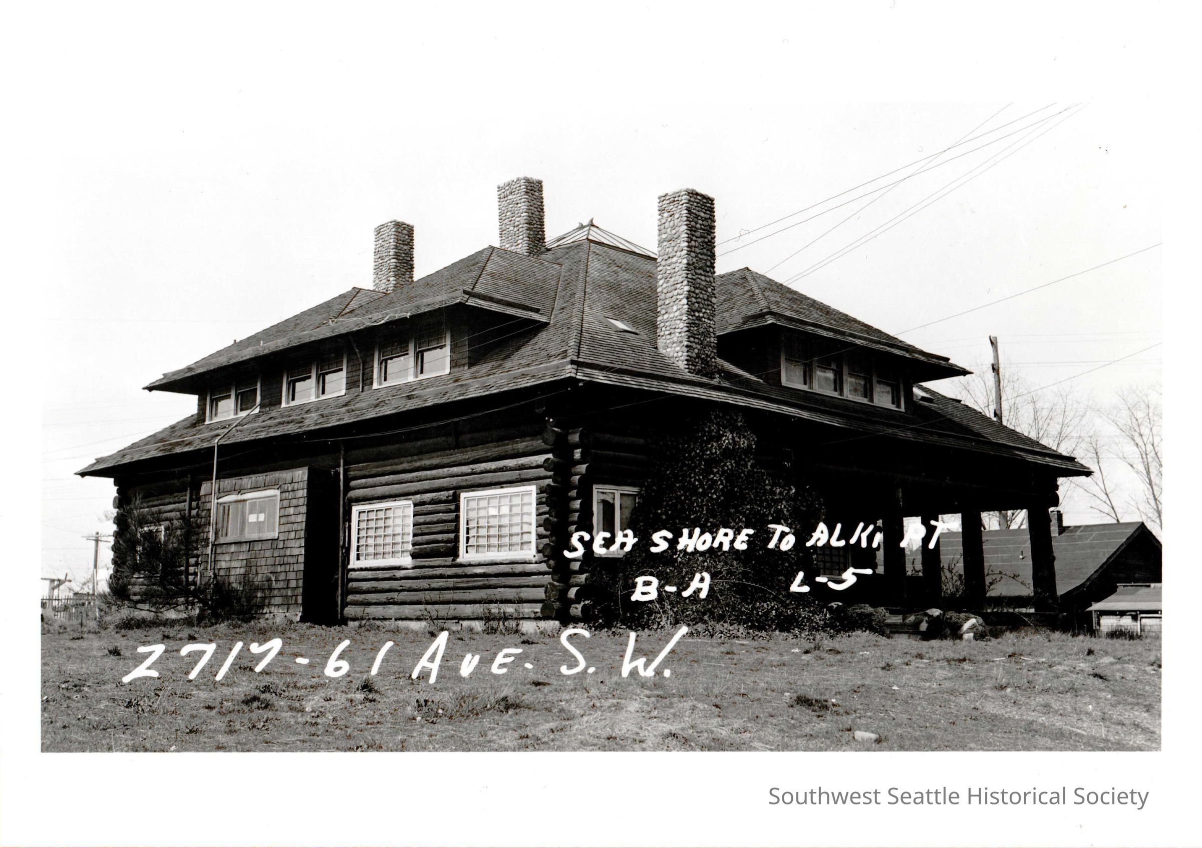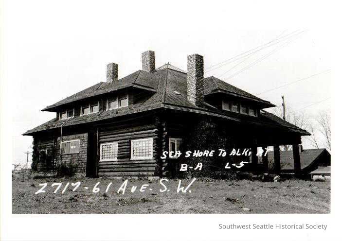 2717 61st Ave. SW showing the log building that was originally Fir Lodge, became the auto club and eventually became The Alki Homestead. Marked "SEA SHORE TO ALKI PT B-A L-5." From Merilee Hagen.Collection