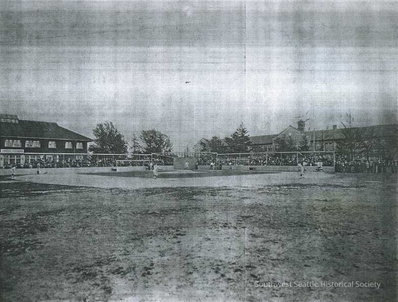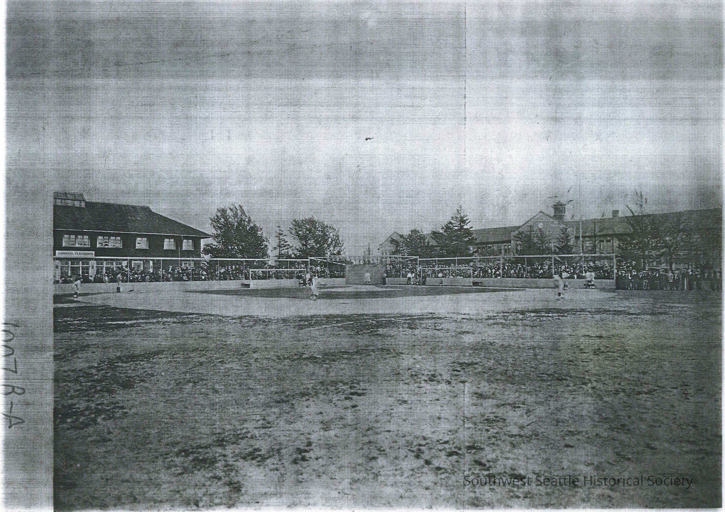 Schools / Photocopy of Hiawatha Playfield during a baseball game - perhaps in the 1920s? shows the fieldhouse on the left and W.S. High School on the right.